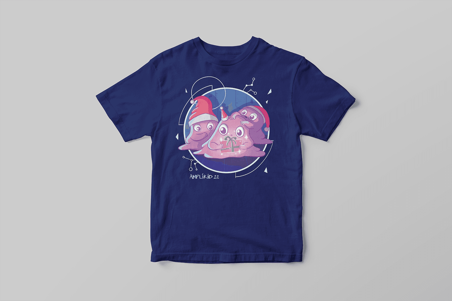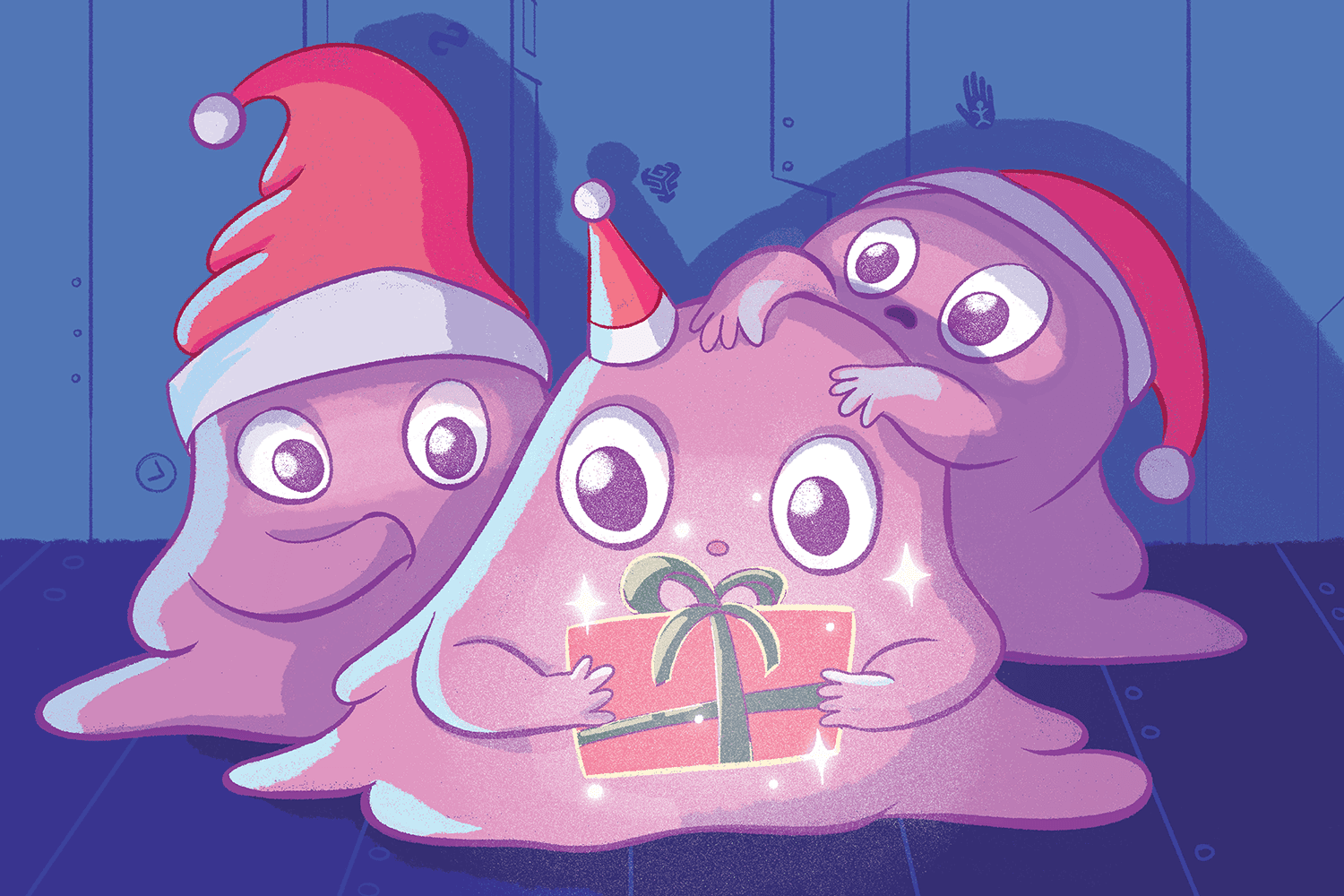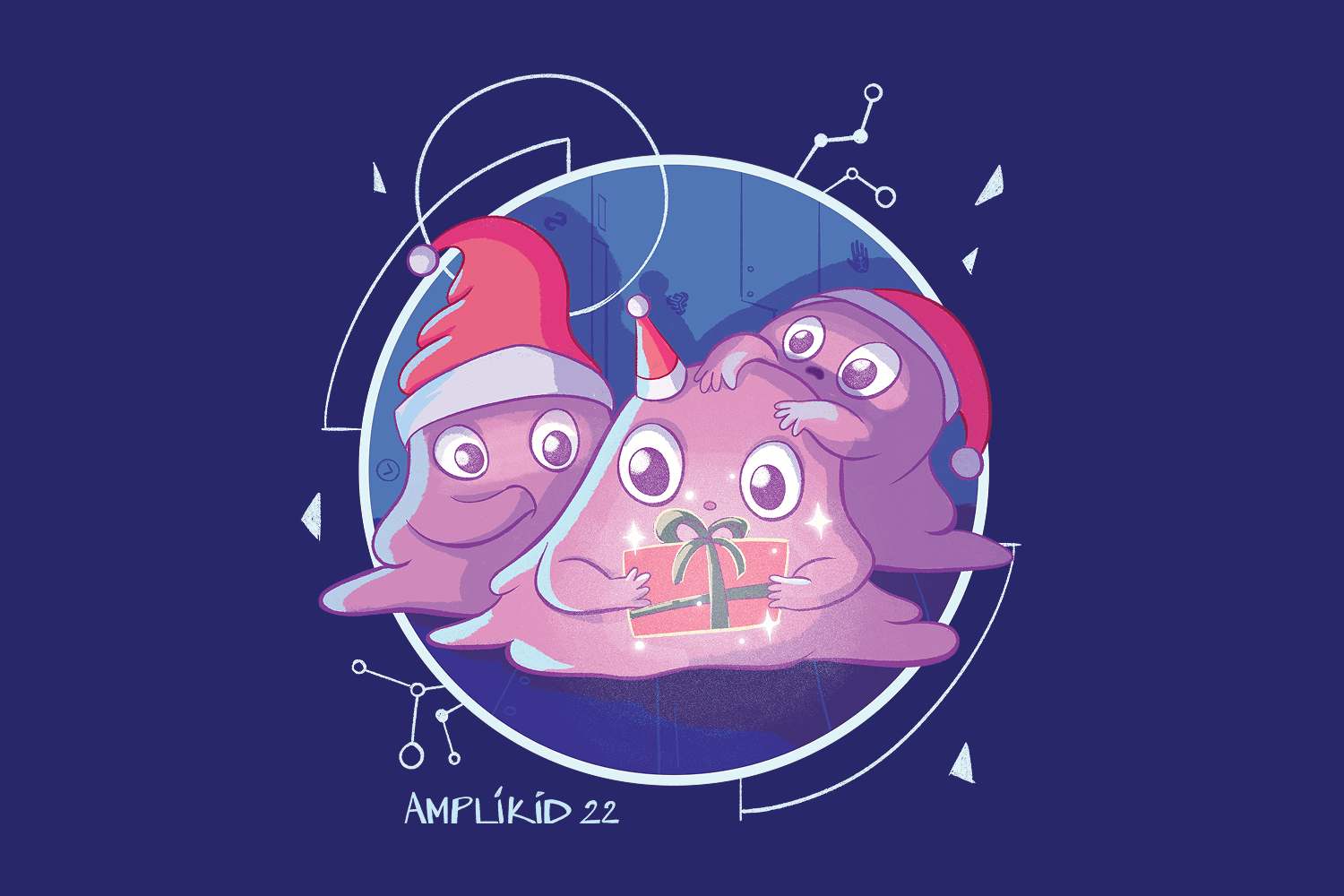 The illustration features an adaptation of a character from the Amplitude Studios’ game Endless Dungeon. The characters were softened to align with the child-friendly brief and drawn in Christmas hats with a present to create the holiday theme.